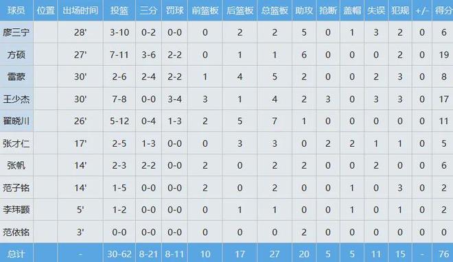 此役周琦展现出极强的统治力,28分钟里投篮21中13,爆砍33分14板;胡金秋投篮14中10,高效贡献24分4板。